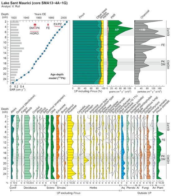 Palynological studies conducted in the PNAESM and its surroundings (Figure 1) have reconstructed the Lateglacial and Holocene vegetation dynamics with multidecadal to centennial resolution [,,]. In Sant Maurici, a 9 m deep core (SMA13-4B) was retrieved from the edge of the former glacial lake (Figure 2). This core contains a fragmentary Holocene record, due to sedimentation interruptions caused by water-level fluctuations []. The Late Holocene section of this core encompasses the Bronze Age (4.3–3.5 cal kyr BP) and the Middle Ages (1.5–0.3 cal kyr BP), with a significant sedimentary gap omitting the interval corresponding to the Iron Age and the Roman period (3.5–1.5 cal kyr BP). The analysis revealed that the highland forests around the lake maintained stability in abundance and composition, even through temperature and moisture shifts associated with the Bronze Age Warm Period (BAWP), the Dark Ages Cold Period (DACP), the Medieval Climate Anomaly (MCA), and the Little Ice Age (LIA). Human activities in the area were intermittent and of low intensity, exerting minimal impact on the forest dynamics [].