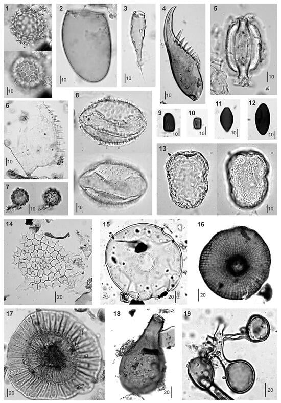 The main NPP (nonpollen palynomorphs) identified in Sant Maurici core SMA13-4A-1G. 1, NPP16; 2, Neorhabdocoella egg (tardigrada); 3, Acari leg; 4, Chironomid mandible; 5, Pinus stoma; 6, Cladocera mandible; 7, NPP7; 8, NPP14; 9–10, Sporormiella spores (fungi); 11, Sordaria spore (fungi); 12, Podospora spore (fungi); 13, NPP18; 14, Pediastrum coenobium (algae) 15, Arcella shell (tecamoebae) 16–17, Microthyrium ascomata (fungi); 18, Habrotrocha shell (rotifera); 19, Glomus spores (fungi). Bar sizes in μm.