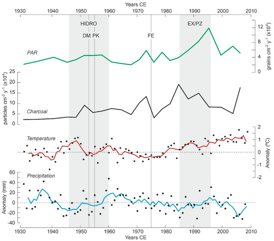 Comparison of pollen accumulation rates (PAR) as a proxy for forest cover, and charcoal influx, as a proxy for fire incidence, with annual average temperature and precipitation trends for the PNAESM. Climatic values are expressed as anomalies and their trends are smoothed using a 4-year moving average (raw data from Ref. []). Abbreviations as in Figure 3: HIDRO, maximum development of hydroelectrical exploitation; DM, damming of Lake Sant Maurici; PK, creation of the PNAESM; FE, restriction of forest exploitation; EX/PZ, park expansion and creation of the protection zone.