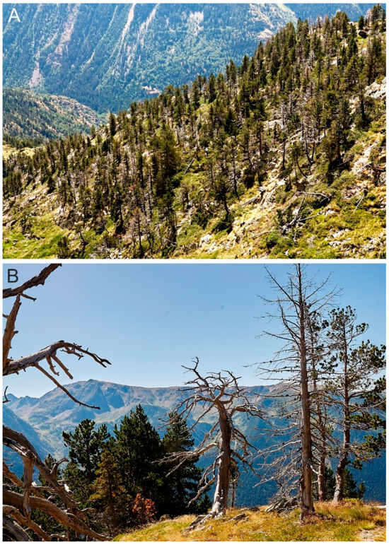 Mountain pine (P. mugo subsp. uncinata) dieback in the surroundings of Lake Naorte, situated 27 km NE from Lake Sant Maurici. (A) Mountain pine forest with a large proportion of dead trees. (B) Close-up of the same forest patch showing some dead pines and others alive with signs of drying (brown tones). Photos: V. Rull.
