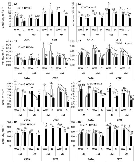 (A) Photosynthesis, (B) leaf conductance, (C) transpiration, and (D) intercellular CO2 concentration on days 7 (white bars) and 14 (black bars) after the onset of drought in Tempranillo (1) and Cabernet Sauvignon (2). Bars represent means (n = 4) ± SD. For each gas exchange parameter and grapevine variety, different lowercase and capital letters indicate significant differences (p ≤ 0.05) on days 7 and 14, respectively, among the different combinations of treatments (non-mycorrhizal, −M; mycorrhizal, +M; well-watered, WW; drought, D; current CO2 and temperature, CATA; and predicted CETE). Asterisks indicate significant differences (*, p ≤ 0.05; **, p ≤ 0.01; ***, p ≤ 0.001) between days 7 and 14. For each variety (T or CS), environmental condition (CATA or CETE), and mycorrhizal inoculation (−M or +M) arrows highlight significant differences between WW and D treatments.