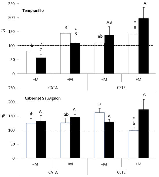Effect of water deficit on the instantaneous water use efficiency (WUE) on days 7 (white bars) and 14 (black bars) after the onset of drought in Tempranillo and Cabernet Sauvignon, either inoculated (+M) or not (−M) with AMF and cultivated under current (CATA) or predicted (CETE) environmental conditions. Results are expressed as percentages of the respective WW controls (100%, dashed line). Bars represent means (n = 4) ± SD. For each grapevine variety, different lowercase and capital letters indicate significant differences (p ≤ 0.05) on days 7 or 14, respectively. Asterisks indicate significant differences (*, p ≤ 0.05) between days 7 and 14.