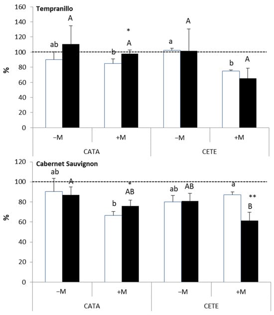 Effect of water deficit on the ratio between intercellular (Ci) and atmospheric (Ca) CO2 on days 7 (white bars) and 14 (black bars) after the onset of drought in Tempranillo and Cabernet Sauvignon, either inoculated (+M) or not (−M) with AMF and cultivated under current (CATA) or predicted (CETE) environmental conditions. Results are expressed as percentages of the respective WW controls (100%, dashed line). Bars represent means (n = 4) ± SD. For each grapevine variety, different lowercase and capital letters indicate significant differences (p ≤ 0.05) on days 7 or 14, respectively. Asterisks indicate significant differences (*, p ≤ 0.05; **, p ≤ 0.01) between days 7 and 14.