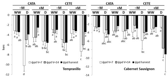 Predawn leaf water potential (Ψpd) on days 7 (white bars) and 14 (grey bars) after the onset of drought and at fruit harvest (black bars) in Tempranillo and Cabernet Sauvignon, either inoculated (+M) or not (−M) with AMF, well-watered (WW) or subjected to drought (D), and cultivated under current (CATA) or predicted (CETE) environmental conditions. Bars represent means (n = 4) ± SD. For each grapevine variety and day, different letters indicate significant differences (p ≤ 0.05).