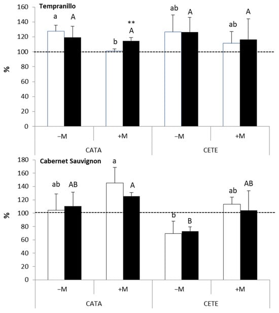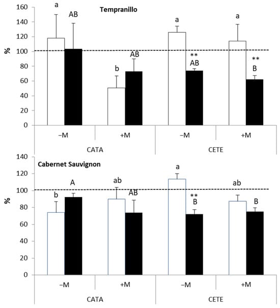 Effect of water deficit on leaf water content (WC) on days 7 (white bars) and 14 (black bars) after the onset of drought in Tempranillo and Cabernet Sauvignon either inoculated (+M) or not (−M) with AMF and cultivated under either current (CATA) or predicted (CETE) environmental conditions. Results are expressed as percentages of the respective WW controls (100%, dashed line). Bars represent means (n = 4) ± SD. For each grapevine variety, different lowercase and capital letters indicate significant differences (p ≤ 0.05) on days 7 or 14, respectively. Asterisks indicate significant differences (**, p ≤ 0.01;) between days 7 and 14.