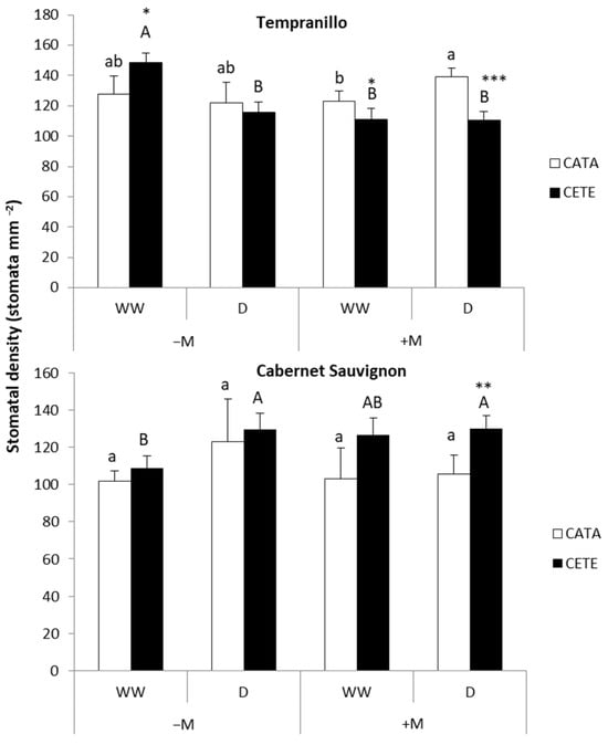 Stomatal density in leaves of Tempranillo and Cabernet Sauvignon, either inoculated (+M) or not (−M) with AMF, well-watered (WW) or subjected to drought cycles (D) and cultivated under current (CATA, white bars) or predicted (CETE, black bars) CO2 concentrations and air temperatures. Data were collected at the fruit harvest. Values are means (n = 4) ± SD. For each grapevine variety, different lowercase and capital letters indicate significant differences (p ≤ 0.05) under CATA or CETE conditions, respectively. Asterisks indicate significant differences (*, p ≤ 0.05; **, p ≤ 0.01; ***, p ≤ 0.001) between CATA and CETE.