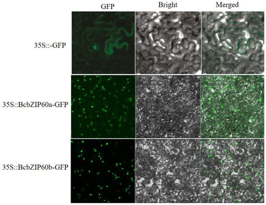 2.10. Subcellular Localization Revealed the Presence of BcbZIP60a and BcbZIP60b in Nucleus