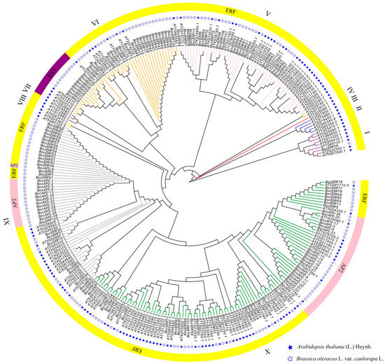 - Okamuro, J.K.; Caster, B.; Villarroel, R.; Van Montagu, M.; Jofuku, K.D. The AP2 domain of APETALA2 defines a large new family of DNA binding proteins in Arabidopsis. Proc. Natl. Acad. Sci. USA 1997, 94, 7076–7081. [Google Scholar] [CrossRef]