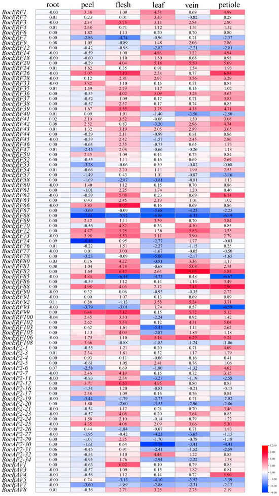 2.7. Expression Analysis of BocAP2/ERFs by RT-qPCR in Different Tissues