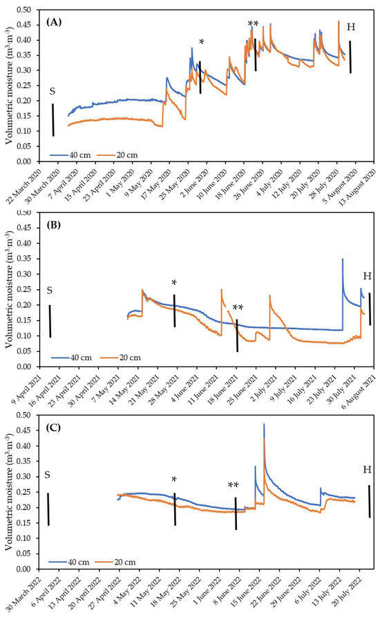 Volumetric soil moisture at 20 and 40 cm under the soil surface in the spring seasons: (A) 2020, (B) 2021, (C) 2022. S—sowing; H—harvesting; *—soluble sugars I sampling; **—soluble sugars II sampling.