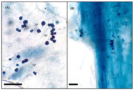 (A) Serendipita indica mycelium and spores (sp.) on vermiculite particle used as inoculum; (B) spores (sp.) of S. indica in spring barley roots. Stained with trypan blue, the bar represents 50 μm.