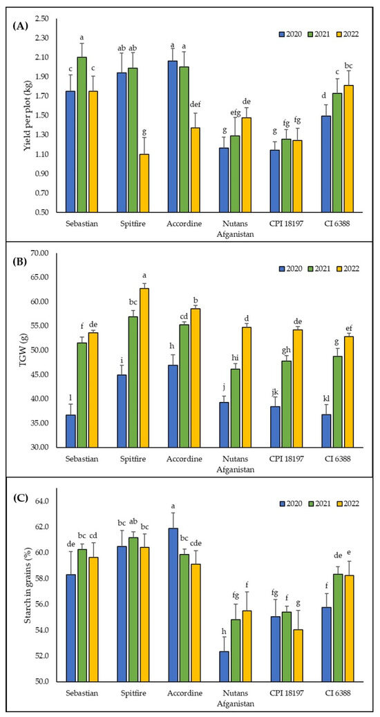 Productivity parameters of genotypes in different seasons. (A) yield per plot, (B) thousand grains weight (TGW), and (C) content of starch in grains. Columns represent means, bars SD (n = 15) followed by the same letter if there was no statistical difference according to the Tukey0.05 test.