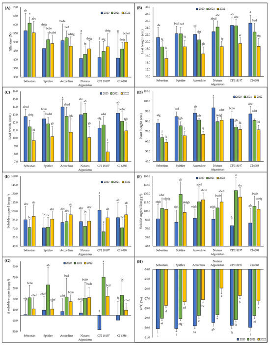 Growth and physiological parameters among genotypes of spring barley during cultivation seasons. (A) tillers/m2, (B) leaf length, (C) leaf width, (D) plant height, (E) soluble sugars I, (F) soluble sugars II, (G) Δ soluble sugars, and (H) δ13C. Columns represent means, bars SD (n = 15) followed by the same letter if there was no statistical difference according to the Tukey0.05 test.