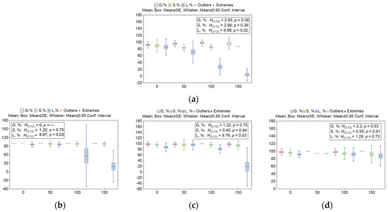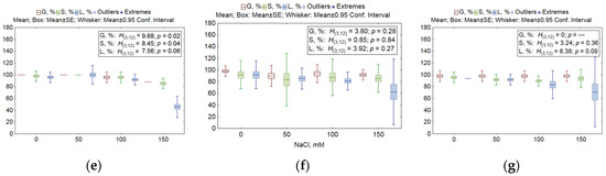 Variation in seed germination (G, %), in the survival rate (S, %), and in the number of seedlings with leaves (L, %) in KO barley lines called nud and win1 after salt stress. (a) The WT, (b) nud 07-1, (c) nud 05-4, (d) nud 01-4, (e) win1 25-2-18, (f) win1 25-2-2, and (g) win1 17-4-14. The number of samples per line was 3. Mean values, standard error (SE), a 95% confidence interval, outliers, and extremes are indicated in the figure. Because no outliers and extremes were detected for G, S, and L, such data points are not presented in the figure. The nonparametric Kruskal–Wallis (KW) test was used, where H is the KW criterion, and p is the significance level. Degrees of freedom (df) of the numerator and denominator of H are given in parentheses.