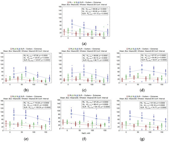 Root length (RL, mm), shoot length (SL, mm), and seedling length (shoot + root; SRL, mm) of nud KO and win1 KO barley lines after salt stress. (a) The WT, (b) nud 07-1, (c) nud 05-4, (d) nud 01-4, (e) win1 25-2-18, (f) win1 25-2-2, and (g) win1 17-4-14. The number of samples per concentration or line was 41–48. Mean values, standard error (SE), a 95% confidence interval, outliers, and extremes are indicated in the figure. The nonparametric Kruskal–Wallis (KW) test was used, where H is the KW criterion, and p is the significance level. Degrees of freedom (df) of the numerator and denominator of H are given in parentheses.
