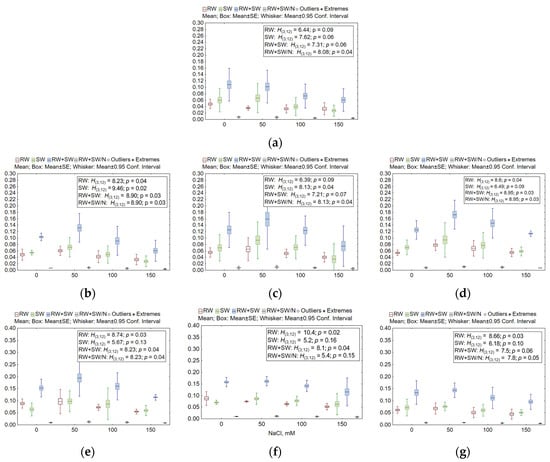 Variation in air-dry weights of seedlings (RW: roots, SW: shoots, RW+SW: seedlings, and RW+SW/N: per seedling) of nud KO and win1 KO barley lines after salt stress. (a) The WT, (b) nud 07-1, (c) nud 05-4, (d) nud 01-4, (e) win1 25-2-18, (f) win1 25-2-2, and (g) win1 17-4-14. The number of samples per concentration or line was 3. The mean values, standard error (SE), a 95% confidence interval, outliers, and extremes are indicated in the figure. Given that there were no outliers and extremes detected for RW, SW, RW + SW, and RW + SW/N, such data points are not presented in the figure. The nonparametric Kruskal–Wallis (KW) test was used, where H is the KW criterion, and p is the significance level. Degrees of freedom (df) of the numerator and denominator of H are given in parentheses.