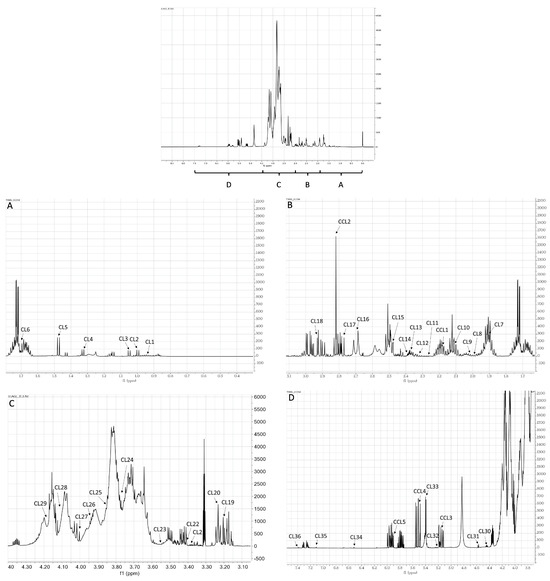 NMR data were acquired on a Bruker. NMR spectra analysis and metabolite quantification were then performed by using the online server NMRProcFlow (INRA UMR 1332 BFP, Bordeaux Metabolomics Facility, Villenave d’Ornon, France) [116] following the method reported by Grimaldi et al. [117]. Briefly, corrections of phasing and baseline were performed manually for all spectra using TOPSPIN version 3.2. All spectra were calibrated by using the internal standard at 0 ppm. Spectral area integration was achieved by variable sized bucketing using the online server NMRProcFlow. Buckets with a signal-to-noise ratio above 3 were selected for further analysis. The residual solvent regions of water (δH 4.65–4.75) were removed (Figure S5, Supplementary Materials). The data matrices generated by NMRProcFlow, one of five buckets (CCL compounds) and one of 36 buckets (CL compounds), were then subjected to multivariate analysis. The metabolite identification was assessed by comparison of their 1H NMR spectra to those of the Chenomx 600 MHz libraries.