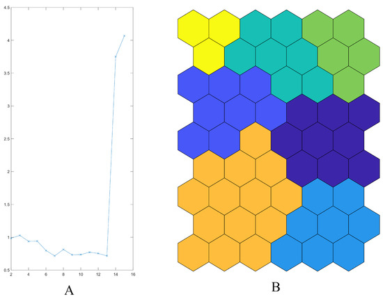 SOM: map clusterization. Five CCL variables (Chenomx 600 MHz custom library metabolites). (A) Davies–Bouldine index progression: minimum value fits the best number of clusters; (B) Seven clusters.