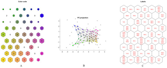 SOM: graphical representation of five CCL variables (Chenomx 600 MHz custom library metabolites) on map. (A) SOM output map with color code association. Similar colors have similar characteristics; numbers correspond to hit numbers. The dimensions of the hexagons are related to the distance between neurons (the greater the size, the greater the distance). (B) Principal component projection of the map; (C) labelled SOM output map, for each neuron the corresponding accession number (Table S1, Supplementary Materials) and number of replicates (in parentheses) are shown.