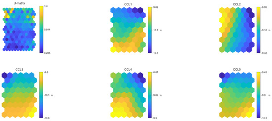 SOM: U-matrix and maps for each CCL variable (Chenomx 600 MHz custom library metabolites). Similar color gradations indicate highly correlated variables. CCL1: S-methyl-L-cysteine, CCL2: methiin, CCL3: S-allyl-L-cysteine, CCL4: L-alliin, CCL5: allicin.