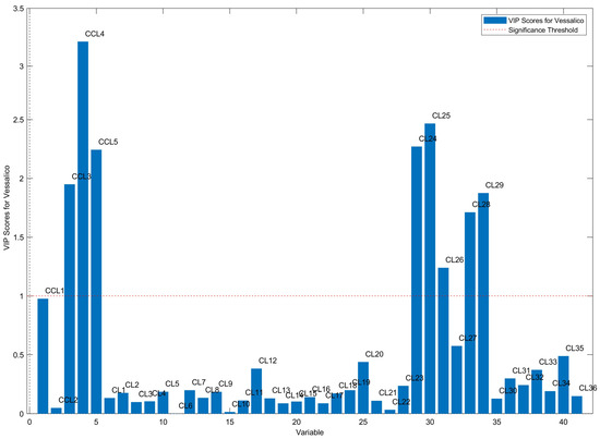 The OPLS-DA method was also used to select the most discriminant metabolites based on values of VIP (Variable Influence on Projections) greater than 1. VIP variables for this set of data are shown in Figure 7.