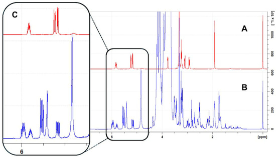 Spectra (1H NMR) of S-allyl-L-cysteine (A), and accession 12 extract (B). Zoom of spectra from δH 4.70 ppm to 6.30 ppm (C). The isolated doublet at 5.18 ppm (in the black square) of S-allyl-L-cysteine was used for the quantification.