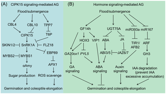 CIPK15-mediated (A) and phytohormone-mediated (B) signaling pathways in regulating rice submergence tolerance during seed germination and seedling establishment stages.