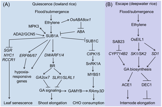 Rice is the only crop that can successfully germinate and grow under submergence. When germinated underwater, the coleoptile elongates rapidly, whereas the growth of the roots and leaves are blocked. The rapid elongation of the hollow coleoptile acts as a snorkel, extending to the water surface, thereby obtaining more O2 to support seedling establishment. Thus, anaerobic germination (AG) and coleoptile elongation are two major adaptive traits during the early growth stage of rice upon submergence [6,7,8,9]. From seedlings to mature plants for harvesting, submergence seriously compromises the overall growth, development, and yield potential of rice [10]. Based on flooding regimes, rice can be roughly divided into two major ecotypes: rain-fed lowland rice that experiences shallow submergence, and deepwater rice that experiences medium to deep submergence during the monsoon season [11,12,13,14,15]. In these cases, two completely different strategies, quiescence and escape, are employed for optimal growth and survival. For example, certain landraces of lowland rice (e.g., FR13A) show flooding tolerance for up to two weeks by entering into an energy conservation mode, in which growth is temporarily arrested and energy sources are conserved for regrowth after the stress conditions subside. In contrast, deepwater rice exhibits the potential for rapid growth (especially internode elongation), consuming carbohydrate resources, so that the upper leaves rise above the water level to escape submergence [2,12,16].