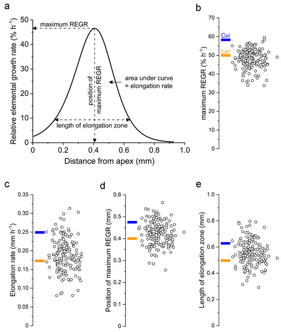 which is the flexible logistic function that Morris and Silk [4] developed for the kinematic analysis of velocity profiles. Figure 1c displays velocity profiles obtained in independent trials of an arbitrarily selected RIL to show typical variability. The average curve also displayed in Figure 1c was created by averaging the fitted parameters of the individual trials for that RIL. Taking the first derivative of the velocity profiles in Figure 1c produces the relative elemental growth rate (REGR) curves shown in Figure 1d. The average velocity and REGR profiles for each RIL in the Cvi × Ler RIL population (Figure 1e,f) demonstrate that a large amount of kinematic variation exists in the elongation zone traits represented in this population.
