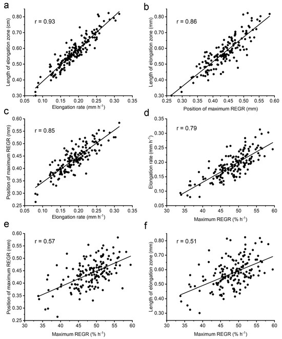 Correlation of each possible combination of four kinematic traits and the r value determined by a linear fit. (a) Length of elongation zone versus elongation rate. (b) Length of elongation zone versus position of maximum REGR. (c) Position of maximum REGR versus elongation rate. (d) Elongation rate versus maximum REGR. (e) Position of maximum REGR versus maximum REGR. (f) Length of elongation zone versus maximum REGR.