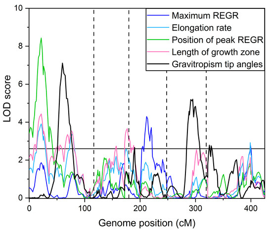 QTL map for each of the four kinematic traits of the elongation zone. The horizontal line is a significance threshold determined by the permutation method. The vertical dashed lines denote the boundaries of the five chromosomes.