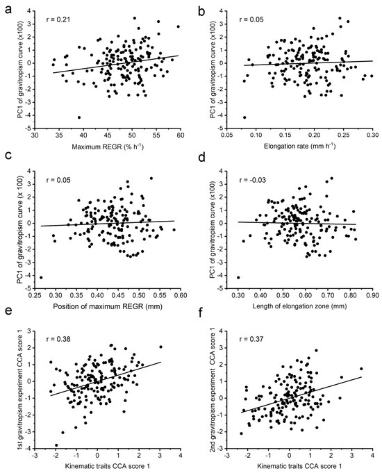Correlations between each elongation zone trait and PC1 of gravitropism curves, and a canonical correlation analysis between all elongation zone traits and gravitropism data. (a) Gravitropism versus maximum REGR; (b) gravitropism versus elongation rate; (c) gravitropism versus position of maximum REGR; (d) gravitropism versus length of elongation zone; (e) canonical correlation analysis (CCA) score of the 1st gravitropism experiment versus the same for the set of four elongation zone traits; (f) same as (e) except the gravitropism data came from a second gravitropism trial.