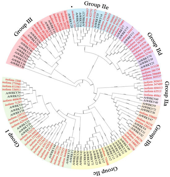 Putative WRKY sequences were identified from the transcriptome data from the tepals of I. laevigata with the online annotation tool from the Beijing Genomics Institute (Beijing, China) (https://www.bgi.com/home, accessed on 3 January 2023). We downloaded all A. thaliana WRKY sequences from the National Center for Biotechnology Information (NCBI) (https://www.ncbi.nlm.nih.gov/, accessed on 3 January 2023). Phylogenetic analysis was conducted in MEGA 5.0 (Version 10.1.8) (https://phytozome-next.jgi.doe.gov/, accessed on 3 January 2023) using WRKY sequences from both I. laevigata and A. thaliana. The open reading frames of these sequences were determined by the ORF Finder tool (https://www.ncbi.nlm.nih.gov/orffinder/, accessed on 3 January 2023), and the conserved domains were identified by the CD Search tool (https://www.ncbi.nlm.nih.gov/Structure/cdd/wrpsb.cgi, accessed on 3 January 2023). WRKY sequences of different species were obtained by BLAST (https://blast.ncbi.nlm.nih.gov/Blast.cgi, accessed on 3 January 2023) at NCBI. Multiple sequence alignment was performed using DNAMAN (Version 5.2.2) (https://www.lynnon.com/dnaman.html, accessed on 3 January 2023). Sequence alignment was performed using Clustal W (http://www.clustal.org/clustal2/, accessed on 3 January 2023), followed by the construction of a phylogenetic tree using the neighbor-joining (NJ) method with 1000 bootstraps. The resulting tree was then annotated using iTOL (https://itol.embl.de/, accessed on 3 January 2023).