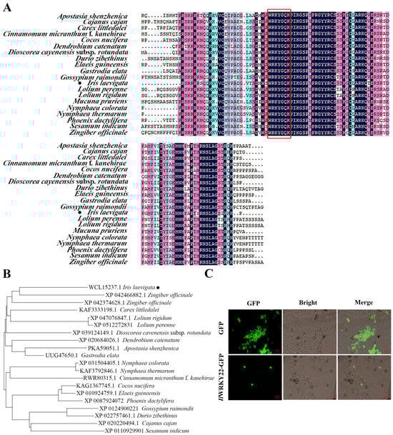 Sequence phylogenetic analysis and subcellular localization of IlWRKY22. (A) Protein sequence alignment of IlWRKY22 and that of other plant species (Zingiber officinale, Zingiber officinale, Carex littledalei, Lolium rigidum, Lolium perenne, Dioscorea cavenensis subsp. rotundata, Dendrobium catenatum, Apostasia shenzhenica, Gastrodia elata, Nymphaea colorata, Nvmphaea thermarum, Cinnamomum micranthum f. kanehirae, Cocos nucifera, Elaeis guineensis, Phoenix dactvlifera, Gossypium raimondii, Durio zibethinus, Cajanus cajan, and Sesamum indicum). The red box is the highly conserved WRKYGQK domain. Black dots indicate IlWRKY22 from I. laevigata. Among them, purple represents 100% homologous sequence, pink represents ≥75% homologous sequence, blue represents ≥50% homologous sequence, yellow represents ≥33% homologous sequence. (B) A phylogenetic tree of IlWRKY22. Black dots indicate IlWRKY22 from I. laevigata. (C) Subcellular localization of IlWRKY22 protein. From left to right: GFP, bright field and merge signals. Scale bar was 20 μm.