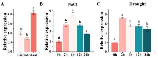 Expression analysis of IlWRKY22. (A) The expression of IlWRKY22 was analyzed in the roots, tubers, and leaves of I. laevigata. (B) The expression of IlWRKY22 was examined under NaCl stress at different time points. (C) The expression of IlWRKY22 was evaluated in response to PEG-6000 at different time intervals. The bar chart in the figure displays the results, with different letters on top indicating significant differences between the groups (p < 0.05).