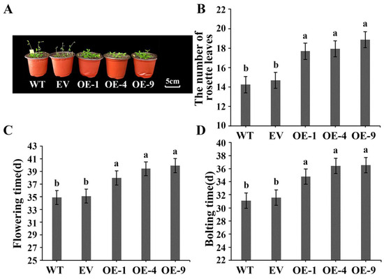 Phenotypes of transgenic A. thaliana overexpressing IlWRKY22. (A) Phenotypic observation of transgenic A. thaliana overexpressing IlWRKY22. Scale bar was 5 cm. (B) The number of rosette leaves at the time of flowering. (C) Flowering time (opening of the first flower). (D) Bolting time (inflorescence stalk of 1 cm). Bar graph data are Mean ± SD, marked with different lowercase letters to indicate significant differences (p < 0.05). WT is wild type plants. EV is empty vector plants. OE-1, OE-4, and OE-9 are overexpressed lines of IlWRKY22. All these experiments were performed in triplicate.