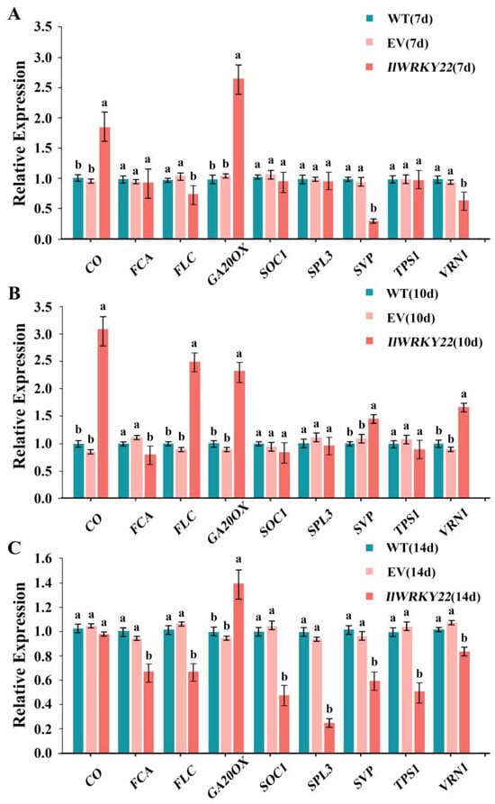 To understand the molecular mechanisms by which IlWRKY22 delays flowering, we quantified the mRNA levels of key genes in flowering pathways. On day 7, the RT-qPCR results revealed significant differences in the expression levels of key genes CO, GA20OX, SVP, FLC, and VRN1 within the photoperiod pathway, GA pathway, and temperature pathway among WT, EV, and OE lines (Figure 5A). CO and GA20OX are significantly up-regulated, while SVP, FLC, and VRN1 are significantly down-regulated. This suggested that IlWRKY22 may regulate these pathways in the early flowering transition. The FLC protein acts as a crucial regulator of flowering, capable of integrating signals from SVP and VRN1 to suppress the expression of FT. On day 10, CO, FLC, SVP, VRN1, and GA20OX are significantly up-regulated, while FCA are significantly down-regulated. It is speculated that with the growth of A. thaliana, the internal transcription environment of the expressing plant is different at different stages, so the expression level changes at day 10. The OE lines exhibited significantly elevated levels of FLC expression compared to the control lines (Figure 5B), which was consistent with their observed delayed flowering phenotype. Among all the genes examined, only GA20OX was up-regulated in the OE plants (1.4-fold higher) compared to the WT and EV plants at day 14, while all other genes showed lower expression levels in the OE plants (Figure 5C). Notably, SPL3 showed 80% down-regulation in the OE plants. This indicated that the OE plants were still at the early stage of flowering transition on day 14. Compared to the control group, at day 14, apart from a significant up-regulation of GA20OX and no significant difference in CO expression levels, all other genes were down-regulated in the OE strain (p < 0.05) (Figure 5C).