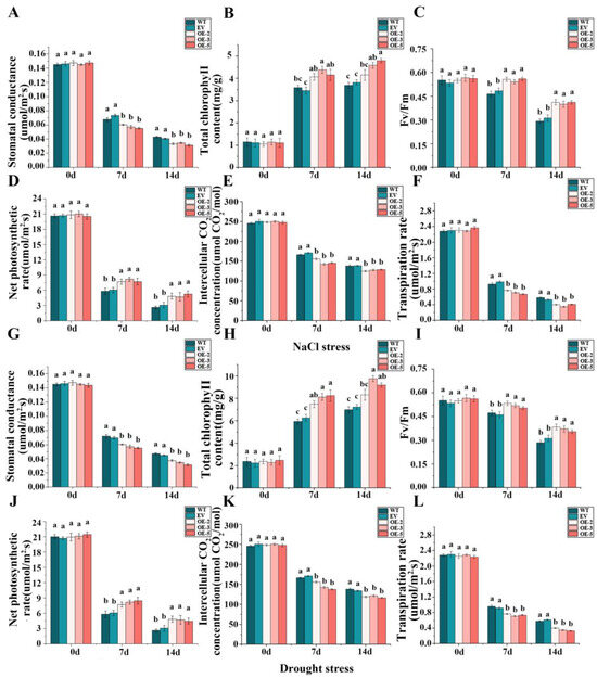 A Li-6400 (ecotek, Beijing, China) portable photosynthesis instrument was utilized to quantify various photosynthetic parameters including net photosynthetic rate (Pn), stomatal conductance (Gs), intercellular CO2 concentration (Ci), and transpiration rate (Tr) from 9:00 am to 10:00 am. Three individual plants were randomly selected from each line (OE, EV, and WT), and the third and fourth leaf were used for measurement. The Li-6400 instrument was calibrated before taking measurements, and data was recorded after the reading was stable. Five measurements were taken for each leaf [39]. The chlorophyll (Chl) content was assessed using the acetone extraction method [45,46]. The functional leaves of the same part were selected, and the chlorophyll fluorescence parameters of the leaves were determined by using a PAM-2500 (WALZ, Effeltrich, Germany) portable modulated chlorophyll fluorometer [39].