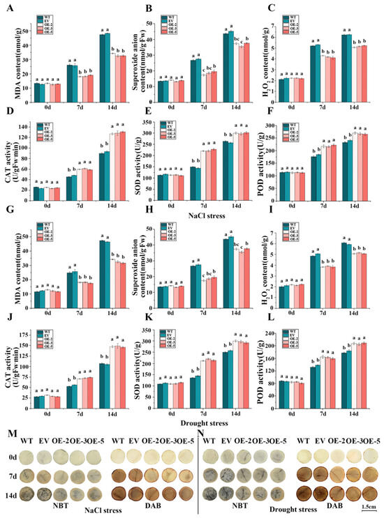 Salt and drought stress can lead to the production of reactive oxygen species (ROS) in plants, which oxidize lipids and generate MDA. Superoxide anions () and H2O2 are the main ROS substances [49]. On the other hand, ROS and their derivatives can be counterbalanced by the antioxidant system including SOD, CAT, and POD [50]. To study the involvement of IlWRKY22 in the ROS clearance enhanced salt and drought stress resistance, we quantified the levels of MDA, , and H2O2, as well the enzymatic activity of SOD, CAT, and POD in the leaf. The results showed that there was no significant difference in MDA, , and H2O2 contents among the five strains under 0 dpt stress. We found increasing levels of MDA, , and H2O2 in all plants as the salt/drought stress progressed (Figure 8A–C,G–I), indicating abiotic stress induced oxidative stress in plants. Under both conditions, the OE plants showed significantly lower levels of MDA, , and H2O2 at both 7 and 14 dpt compared to the control plants (p < 0.05). NBT and DAB can directly show the amount of and H2O2 accumulation through the change of color. At 0 dpt, MDA, , and H2O2 contents of the five lines were not significantly different (p > 0.05), and the color of the plants was gradually deepened with the stress time, which indicated that and H2O2 accumulated more with the passing of time and the plants were subjected to more stress. NBT and DAB staining also showed less and H2O2 accumulation in the OE plants compared to the WT and EV plants (Figure 8M,N). There was no significant difference in SOD, CAT, and POD at 0 dpt (p > 0.05). The difference was that with the increase of time, the activity levels of three enzymes in OE plants were higher than those in the control group (WT, EV), and the ROS levels were lower (Figure 8D–F,J–L). These results indicated that the N. tabacum overexpressing IlWRKY22 had a stronger ability to remove ROS and accumulate fewer harmful substances under salt and drought stresses than the control and could better cope with salt and drought stresses.