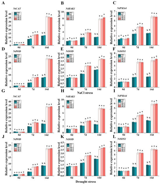 To further investigate the role of IlWRKY22 in enhancing tolerance to salt and drought stress, we quantified the relative expression levels of stress-related genes. Our results revealed that NtCAT, NtHAK1, NtPMA4, NtPOD, NtSOD, and NtSOS1 were significantly up-regulated under both salt and drought stress, regardless of the genetic background (Figure 9). We found that the relative expression levels of these genes were significantly up-regulated in all the tobacco plants at 7 and 14 dpt, but the increase of each gene in the OE-2, OE-3 and OE-5 lines was significantly higher than that of the WT and EV at both time points. However, OE lines showed the highest degree of increase at both 7 and 14 dpt compared to that of the control plants.