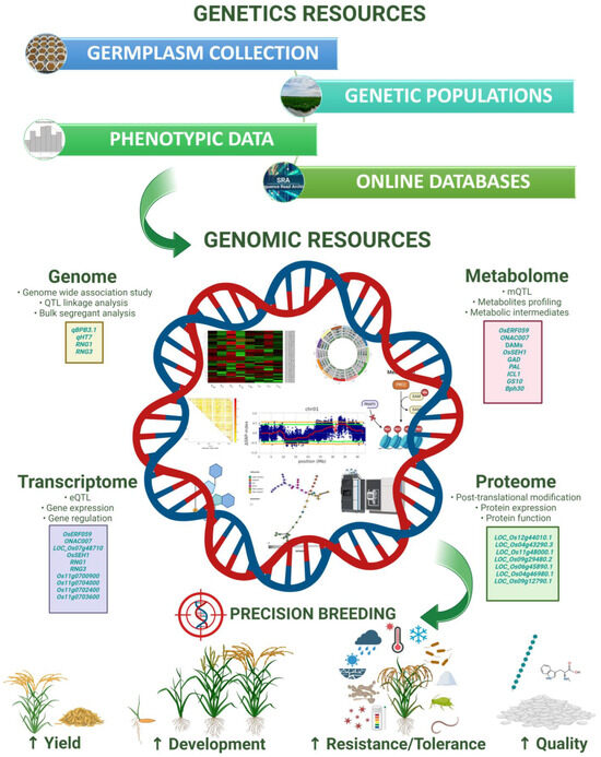 Utilizing genetic and genomic resources for rice breeding enables targeted selection of traits, such as disease resistance, yield potential, quality, and abiotic stress tolerance, leading to the development of improved rice varieties with enhanced productivity and resilience. Some images in this figure are from ‘BioRender.com’.