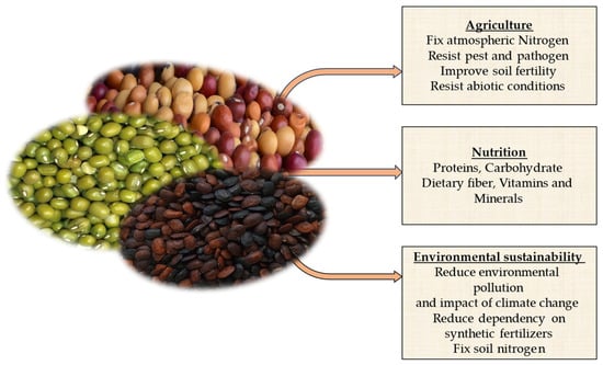 In the face of pressing challenges, such as food insecurity, malnutrition, and environmental sustainability, exploring the benefits of underutilized legumes in agriculture, nutrition, and sustainability has become increasingly significant (Figure 1) [10,11]. Legumes, a diverse family of plants, have long been recognized for their valuable contributions to these areas. While certain legume species have gained widespread attention and cultivation, many other underutilized legumes remain largely untapped. These underutilized legumes, with their unique characteristics and nutritional profiles, offer immense potential in addressing critical global issues of food security, malnutrition, and environmental sustainability [12]. Underutilized legumes play a critical role in enhancing agricultural productivity and resilience [13]. With their capacity to fix atmospheric nitrogen and improve soil fertility, these legumes offer sustainable alternatives to synthetic fertilizers. By incorporating underutilized legumes into cropping systems, farmers can reduce reliance on chemical inputs, prevent soil erosion, and foster sustainable farming practices [14,15]. Moreover, their adaptability to diverse soil conditions and ability to withstand drought make them invaluable assets for farmers operating in challenging environments [16]. Legumes are rich sources of essential nutrients, including proteins, vitamins, dietary fiber, minerals, and bioactive compounds [17]. By incorporating underutilized legumes into diets, especially in regions where protein-energy malnutrition is prevalent, the nutritional quality of meals can be significantly improved [18]. These legumes offer an affordable and sustainable source of high-quality protein, particularly in areas where animal-based protein sources are scarce or expensive [19]. Exploring the nutritional potential of underutilized legumes can contribute to combating malnutrition, improving public health, and reducing the burden of diet-related diseases [12]. Underutilized legumes play a vital role in promoting environmental sustainability. These legumes enhance soil fertility by means of their ability to fix atmospheric nitrogen, reducing the need for synthetic fertilizers that contribute to greenhouse gas emissions [20]. By incorporating underutilized legumes into agricultural systems, sustainable farming practices can be promoted, leading to reduced environmental impacts and increased resilience to climate change [21]. Nevertheless, despite their immense potential, underutilized legumes face various challenges that hinder their widespread adoption. Limited knowledge about their cultivation practices, lack of market demand, and limited research and development initiatives are significant barriers. Addressing these challenges requires collaborative efforts from researchers, policymakers, farmers, and consumers. These necessitate the development of farmer training programs, market development initiatives, and policy support to encourage the cultivation, processing, and consumption of underutilized legumes.