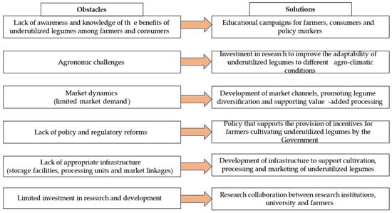 Obstacles hindering the widespread adoption of underutilized legumes and their solutions.