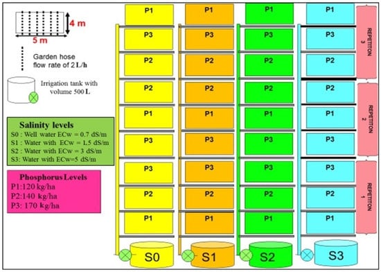 A field experiment, applying four levels of irrigation water salinity and three P-rates, was conducted in a split-plot design with three replications (Figure 2) and using a Moroccan variety of red pepper “Lukkus”. The three P-rates evaluated were 120 (P1), 140 (P2), and 170 (P3) kg P2O5 kg ha−1. P1 is the recommended rate according to the soil status and crop species, P2 is the recommended rate of +20%, and P3 is the recommended rate + 40%. Four water salinity levels were evaluated: freshwater with electrical conductivity (ECw = 0.7 dS.m−1) and three saline water with EC of 1.5, 3, and 5 dS.m–1, respectively. The crop was sown on 8 April 2019 manually at a depth of 3 to 4 cm after the plowing and gentle compaction of the soil (to avoid soil being blown away by the wind). The area of each plot was 20 m2 (4 × 5 m2), composed of six rows with 70 cm row spacing (Figure 2). The nutrients were applied using fertigation with a drip irrigation system. Irrigation with saline water was started 30 days after planting, and the crop was irrigated daily up to the end of the experiment on 24 December 2019. The daily amount was modified each week according to the evapotranspiration (ET0) rate at the experimental station. The total irrigation water applied during the growing season was 606 mm. All plots with different salinity treatments received the same quantity of water in each irrigation event to avoid the confounding effect due to variation in irrigation amount.