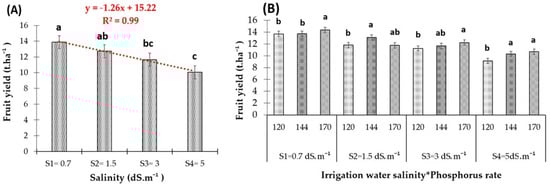 (A) Effect of irrigation water salinity on the fruit yield of red pepper. (B) Interactive effects of the three phosphorus fertilizer rates and each of the four irrigation water salinity levels on the fruit yield of red pepper. Bars with the same letter are not significantly different according to the least significance difference test at p ≤ 0.05. Vertical lines are standard errors.