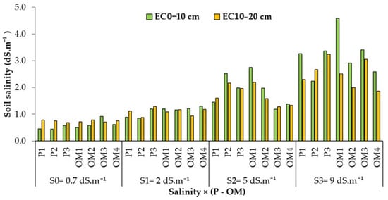 Soil salinity varied with different phosphorus rates and organic matter applications (Figure 6). Saline water irrigation tends to accumulate more salt at a depth of 0–10 cm than at 10–20 cm. Figure 6 indicates that under freshwater conditions, soil salinity was unaffected by varying rates of organic matter and phosphorus. However, at a water salinity of 2 dS.m−1, a P-rate of 36 kg ha−1 resulted in lower soil salinity, whereas the same P-rate led to the highest salt accumulation in the soil at a water salinity of 5 dS.m−1. Excluding freshwater, an organic matter dose of 4 t ha−1 was associated with higher salinity accumulation compared to other levels of organic matter (Table 4).