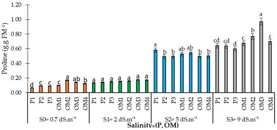 Proline content in red pepper as affected by saline water irrigation interaction with phosphorus and organic matter supply. Error bars indicate the standard deviation. Bars with the same letter are not significantly different according to the least significance difference test at p ≤ 0.05. Salinity × (P, OM): the dynamic interaction between salinity levels and two factors: Phosphorus fertilization and Organic Matter levels.