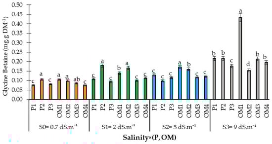 Glycine betaine content in red pepper leaves as affected by the interaction between saline water irrigation, phosphorus, and organic matter supply. Error bars represent the standard deviation. Bars with the same letter are not significantly different according to the least significance difference test at p ≤ 0.05. Salinity × (P, OM): the dynamic interaction between salinity levels and two factors: Phosphorus fertilization and Organic Matter levels.