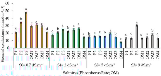 Stomatal conductance of red pepper as affected by saline water irrigation interaction with phosphorus and organic matter supply. Error bars indicate the standard deviation. Bars with the same letter are not significantly different according to the least significance difference test at p ≤ 0.05. Salinity × (Phosphorus rate; OM): the dynamic interaction between salinity levels and two factors: Phosphorus fertilization and Organic Matter levels.