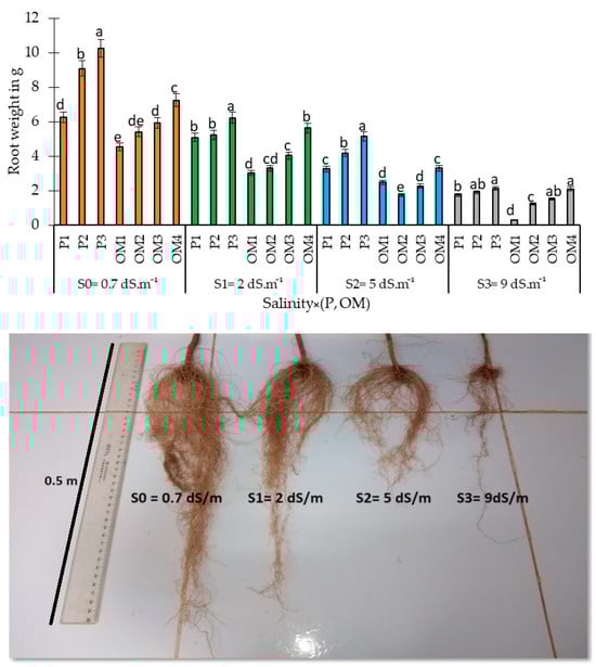 Variation of root development (weight and length) under different saline water irrigation levels. Bars with the same letter are not significantly different according to the least significance difference test at p ≤ 0.05. Salinity × (P, OM): the dynamic interaction between salinity levels and two factors: Phosphorus fertilization and Organic Matter levels.